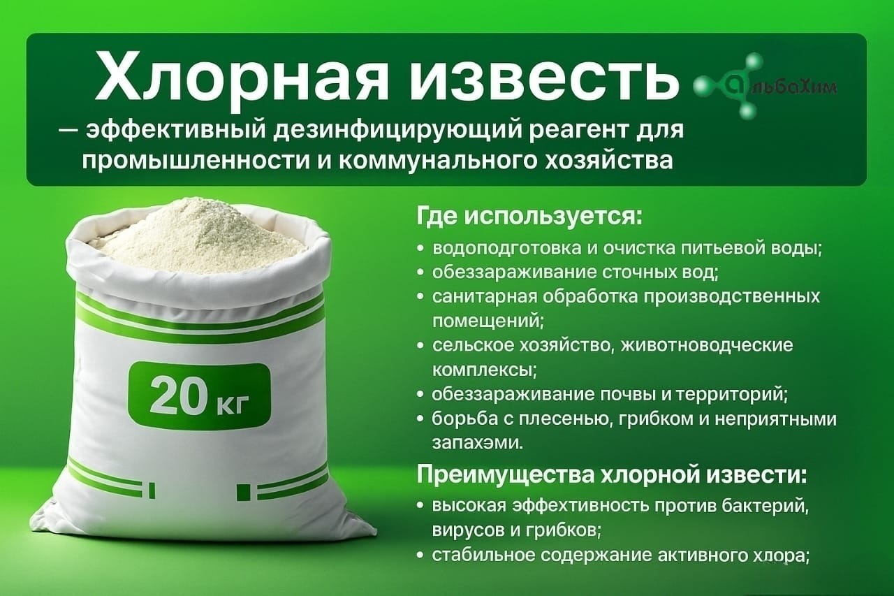 Хлорная известь — один из самых востребованных дезинфицирующих и обеззараживающих материалов. Благодаря высокому содержанию активного хлора, она обеспечивает мощный антимикробный эффект и применяется в самых ответственных сферах.